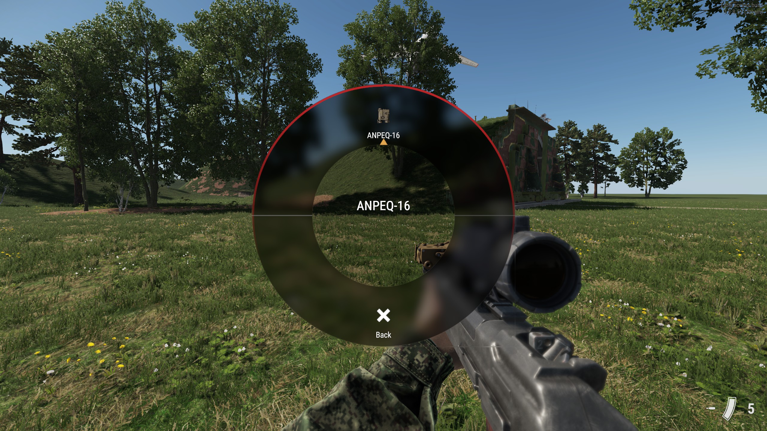 <figure><img src="https://370758970-files.gitbook.io/~/files/v0/b/gitbook-x-prod.appspot.com/o/spaces%2FVykVVurkMJOzqmISKydU%2Fuploads%2Fgit-blob-3bc81fb72bb5cd3a793606129027b631d9083204%2F20230511151259_1.jpg?alt=media" alt=""><figcaption><p>Radial menu when ANPEQ-16 is attached to the weapon</p></figcaption></figure>