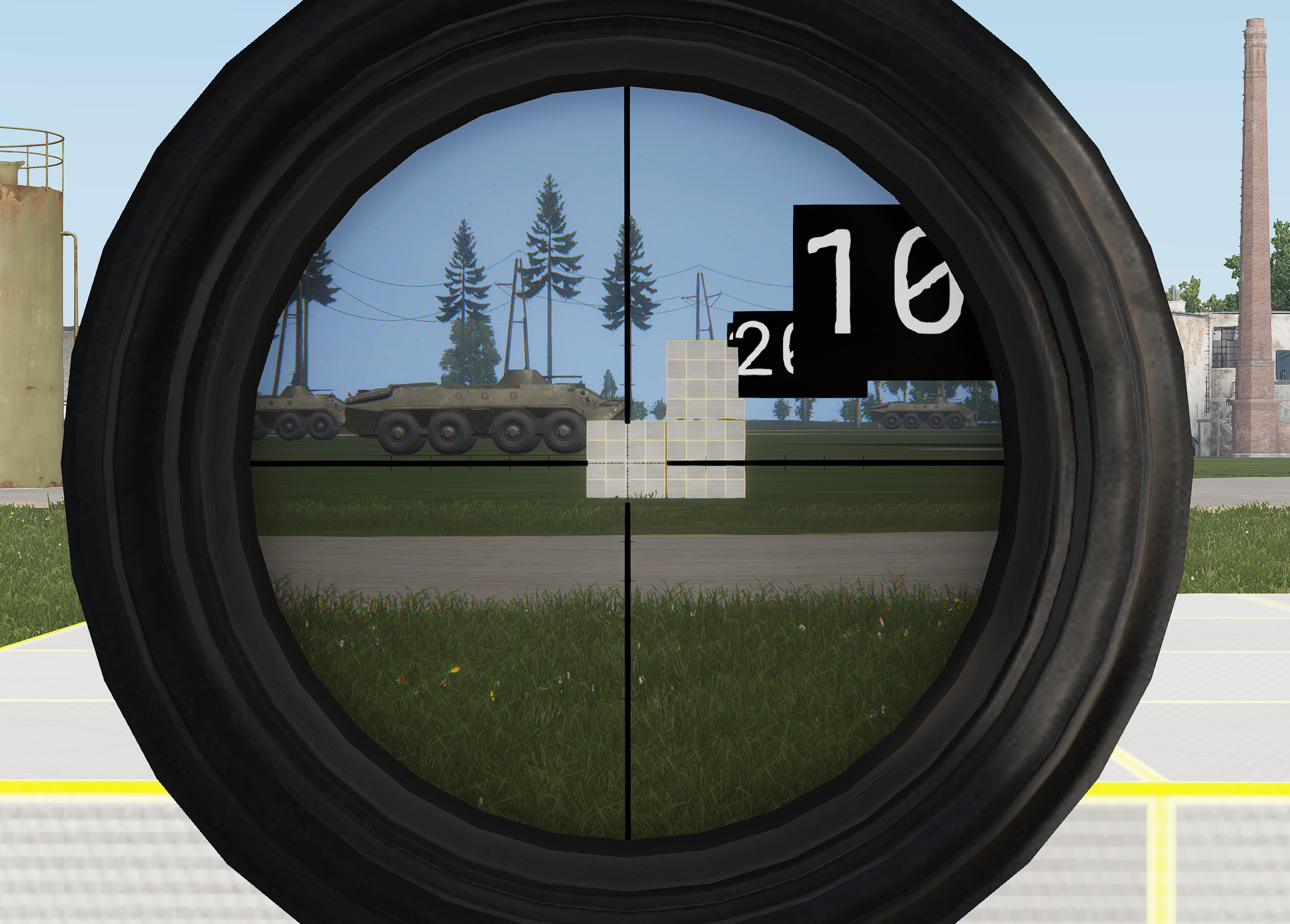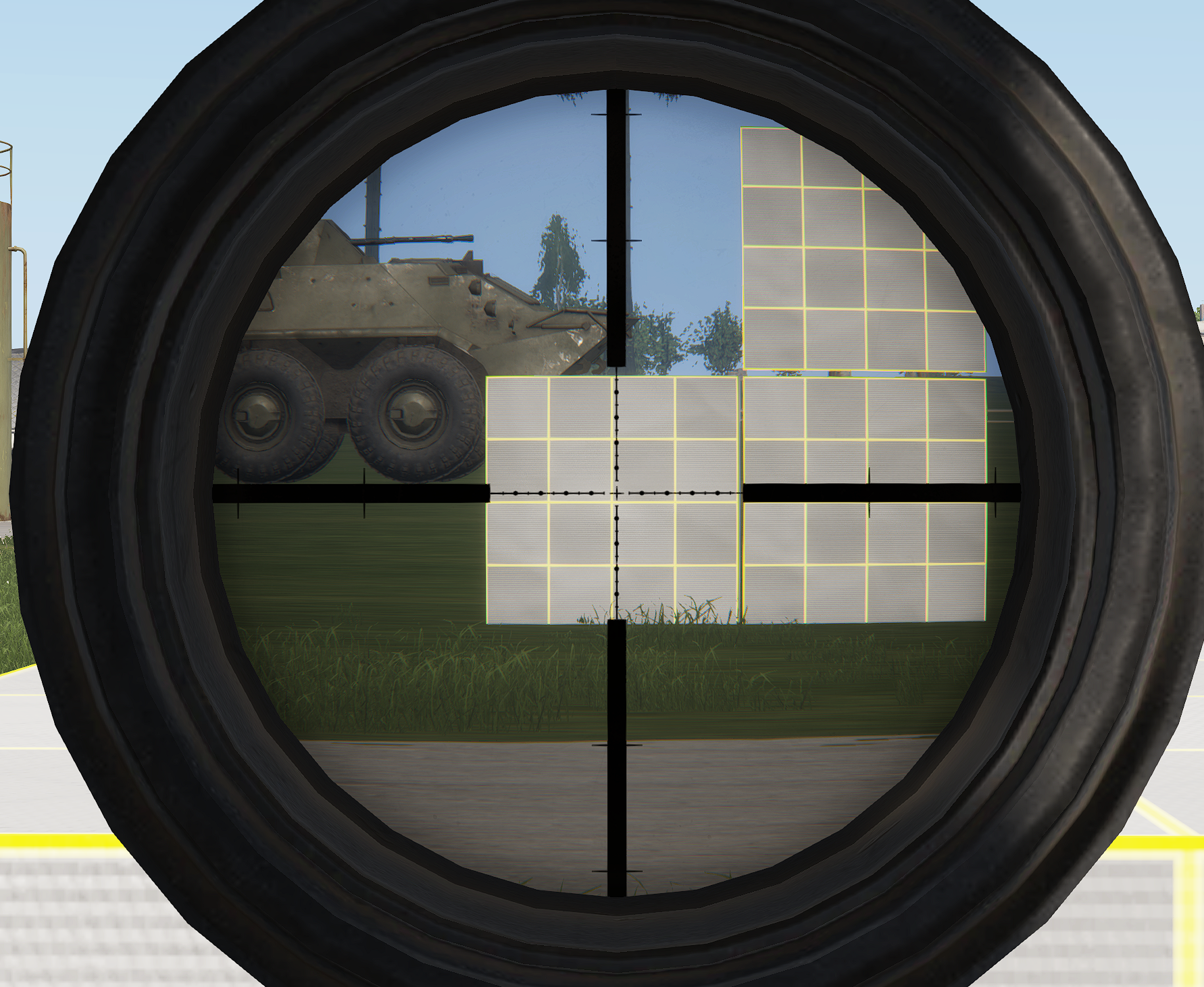 The reticle scales with the selected zoom so that the reticle markings can be used correctly. The separation between major dots is 1 mil. 1 mil corresponds to 1 m spacing at a distance of 1 km. In the image below you can see a 1 m cube being sighted at 100 m being exactly 10 mils at 3x zoom and below you can see the same at 12x zoom.