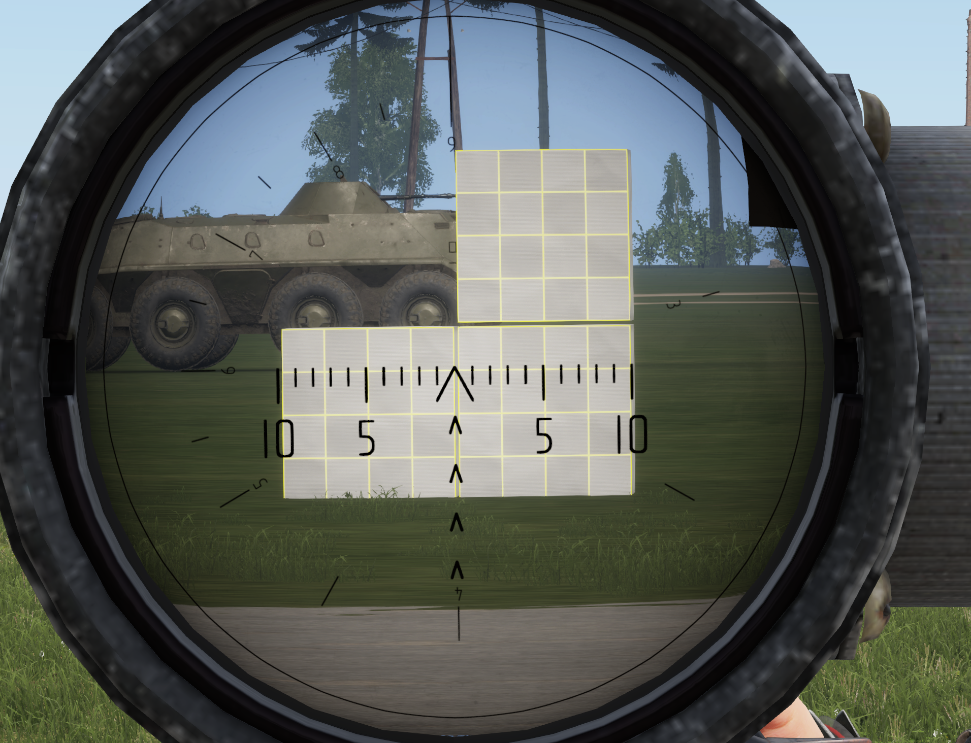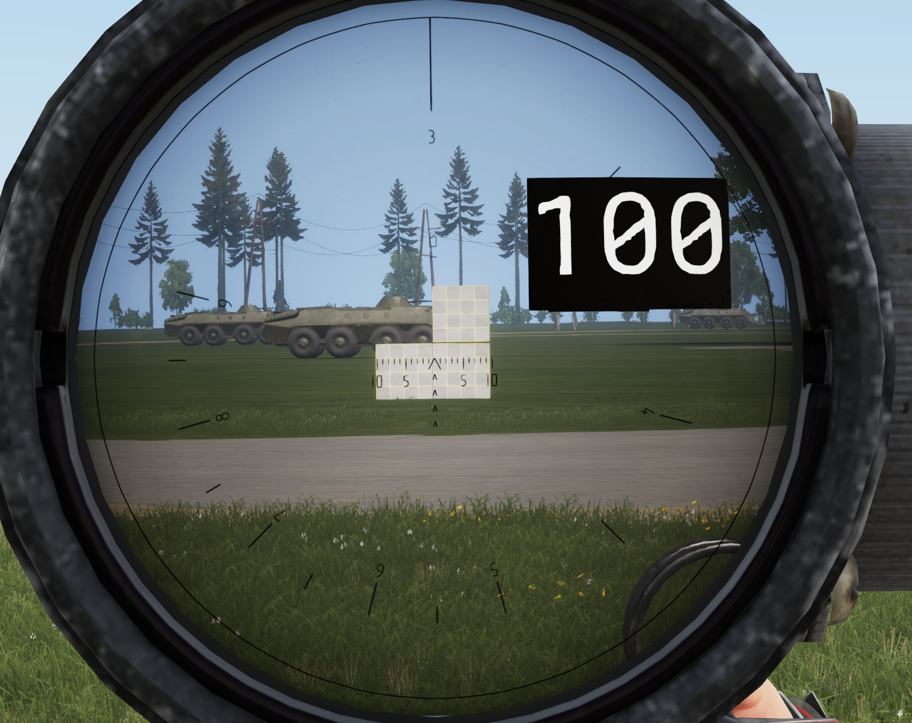 The reticle scales with the selected zoom so that the reticle markings can be used correctly. The separation between major lines is 5 mils. 1 mil corresponds to 1 m spacing at a distance of 1 km. In the image below you can see a 1 m cube being sighted at 100 m being exactly 10 mils at 3x zoom and below you can see the same at 9x zoom.
